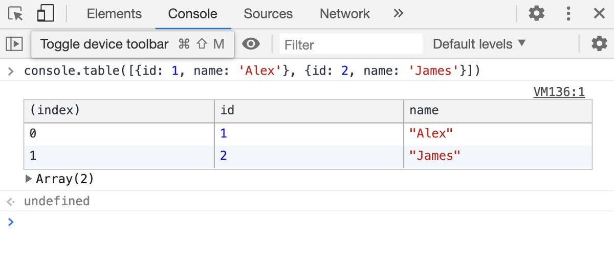 Want to log an array of data? Use console.table() and your array will be rendered in to a table