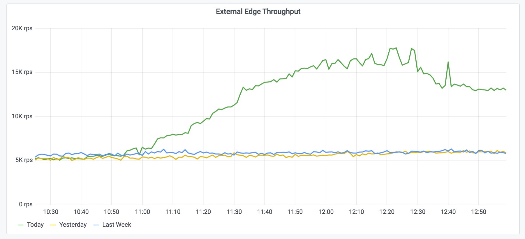 The graph below, which shows the number of requests per second to Monzo on launch-day vs the previous day, is testament to the work of the platform engineers who built a system that could manage a 3-fold increase in requests, without fail.
